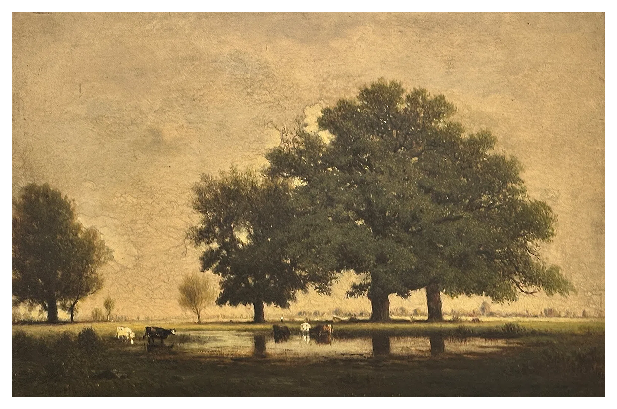 12 x 18, oil on cradled panel. "Gilbert Munger" lower left, "Gilbert Munger" nameplate on the frame. The locale is similar to other Barbizon paintings. The foreground trees are rendered in fine detail. The painting is offered at a Doyle Auctioneers Boston Collects 6 Feb 2026 11am EST auction (available on liveauctioneers.com) as lot 1012, est $800 - 1,200. Image from Doyle website.Prev Next